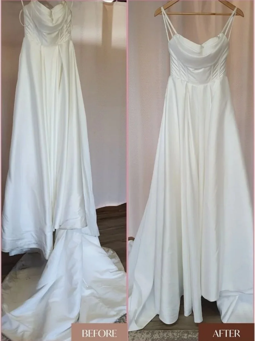 The simplest service might be $150 for a one-layer hem with a small tack to a split. The most intricate transformations, including cleaning, reshaping, bead restoration, veil work and structural changes, can reach around $2,500. Most brides find their gown falls between $800 and $1,700, depending on the complexity and craftsmanship involved.